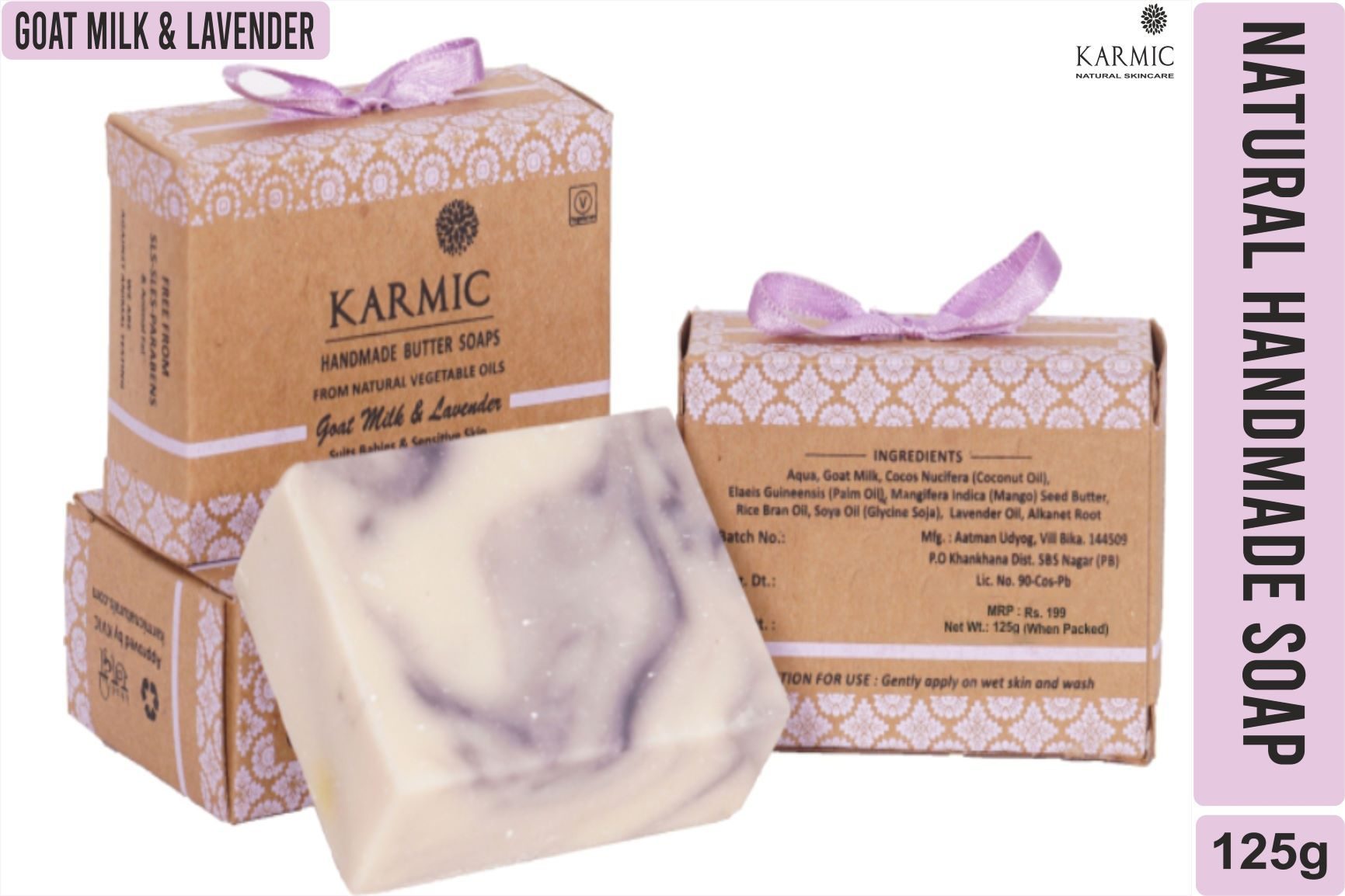 Ingredients : Aqua, Fresh Goat Milk, Cocos Nucifera (Coconut Oil), Elaeis Guineensis (Palm Oil), Rice Bran Oil, Soyabean Oil, Mangifera Indica (Mango) Seed Butter, Lavender Oil, Alkanet Root Extract